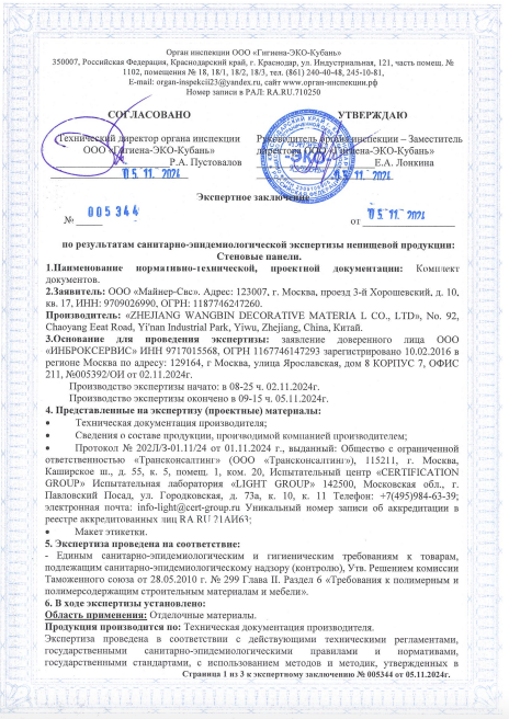 Подтверждает, что стеновые панели MY STEP соответствуют санитарно-гигиеническим требованиям, безопасны для использования в жилых помещениях и не оказывают вредного воздействия на человека.