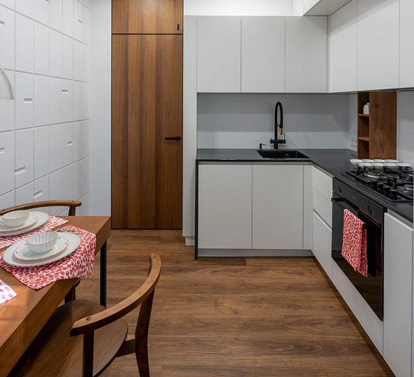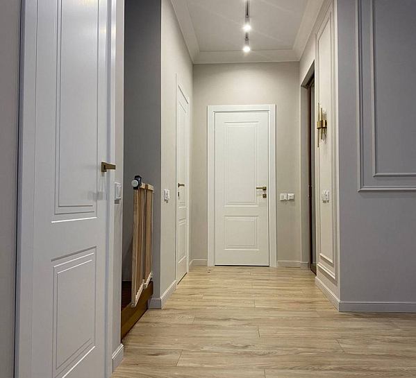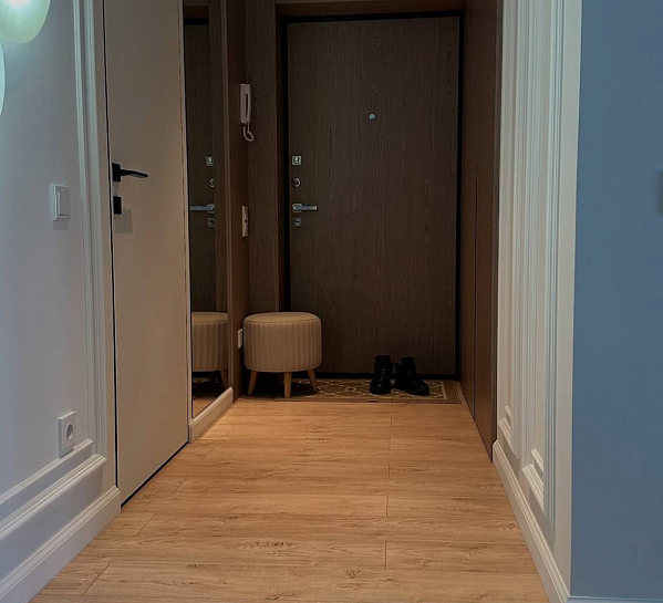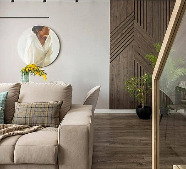 Перед вами — идеальный пример, как правильное напольное покрытие создает атмосферу уюта и гармонии. В этом проекте используется ламинат My Step Мега «Дуб Неаполь» MS2312 — теплый коричневый оттенок, который: