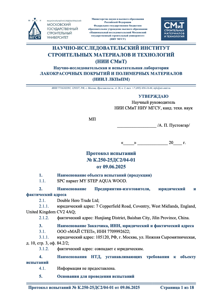 Пожарная безопасность SPC-паркета My Step (плиты из композитного материала с натуральным шпоном). Класс пожарной опасности КМ2, группа воспламеняемости В2, дымообразование Д2, токсичность Т2, распространение пламени РП1.